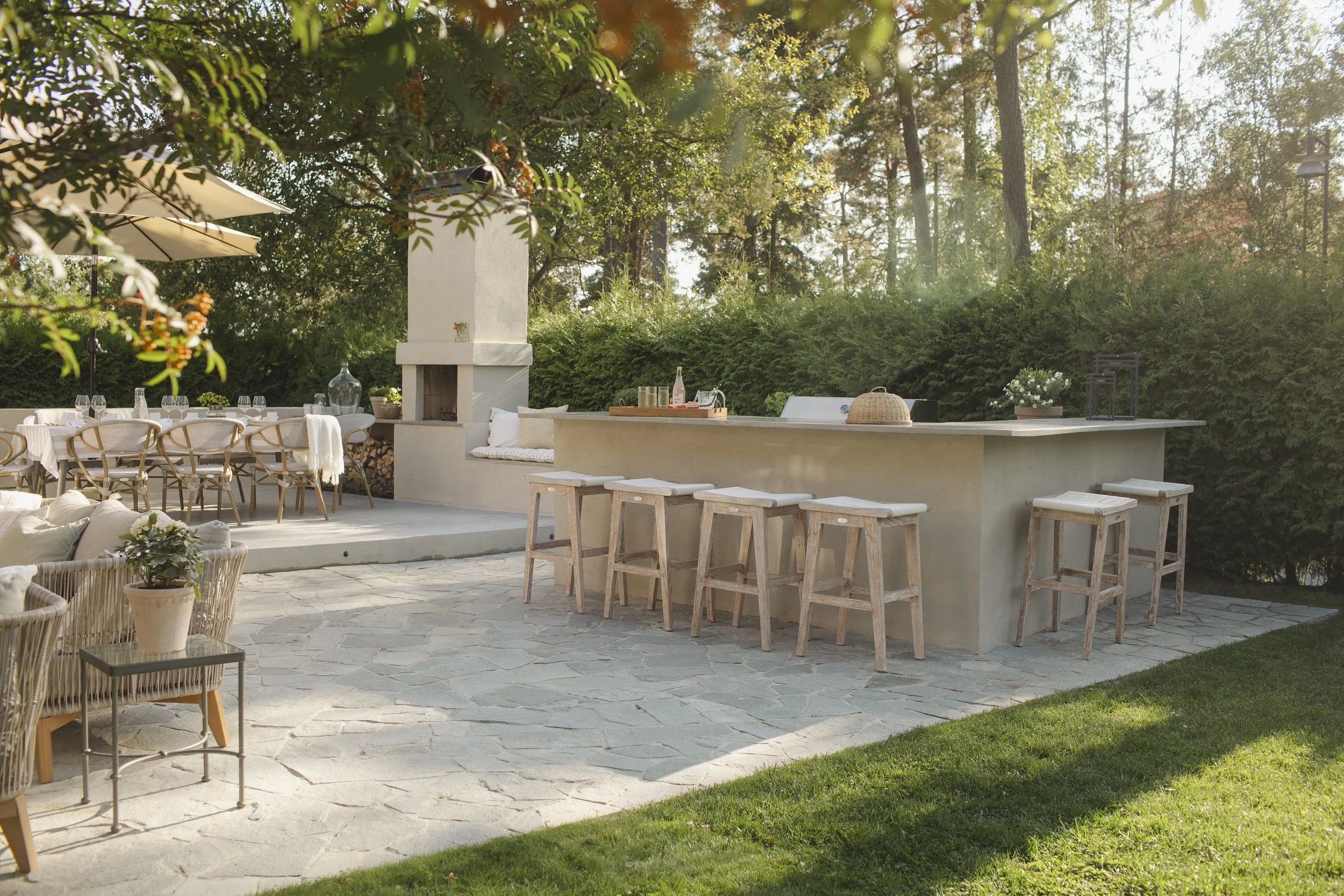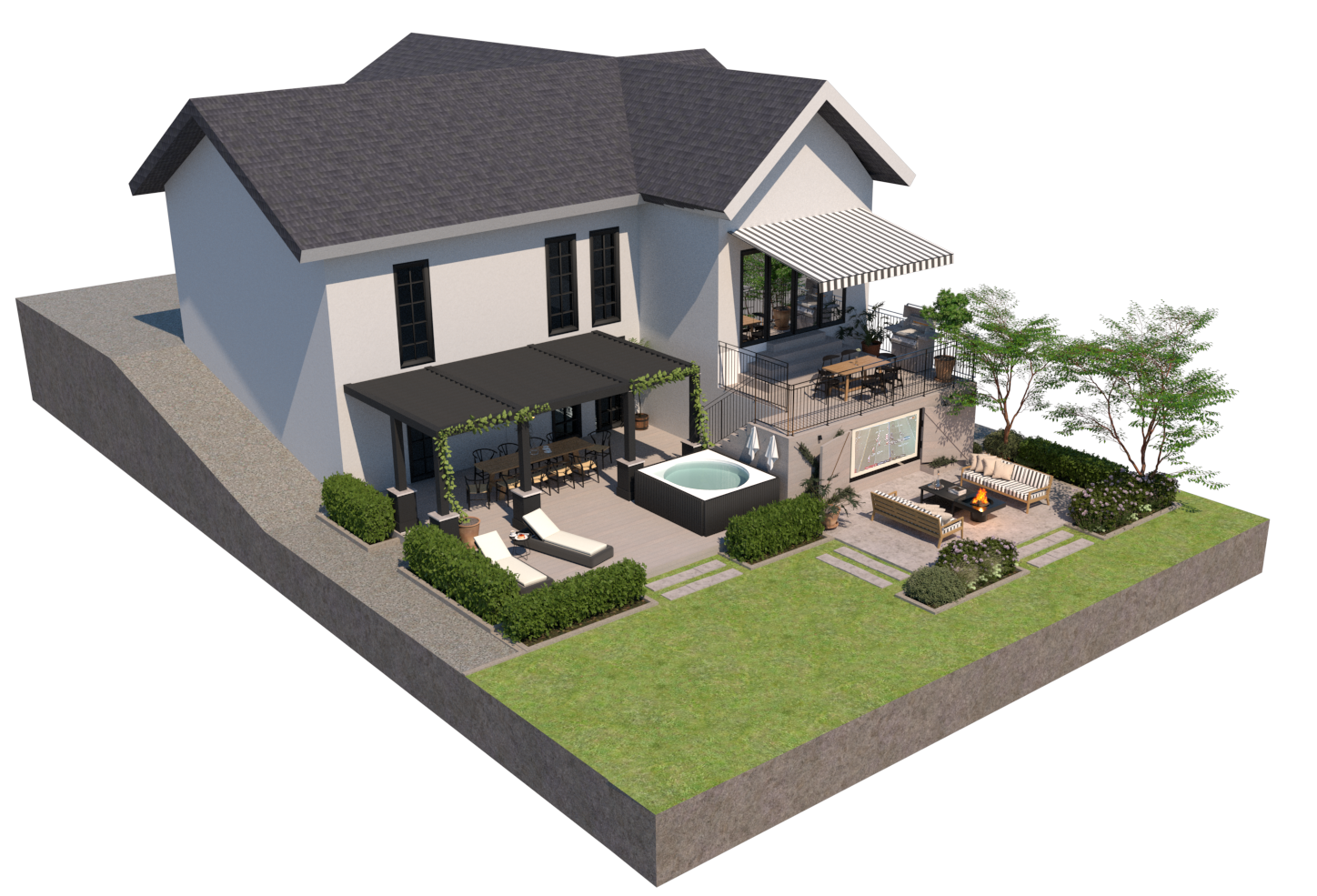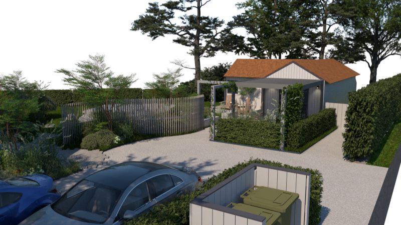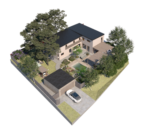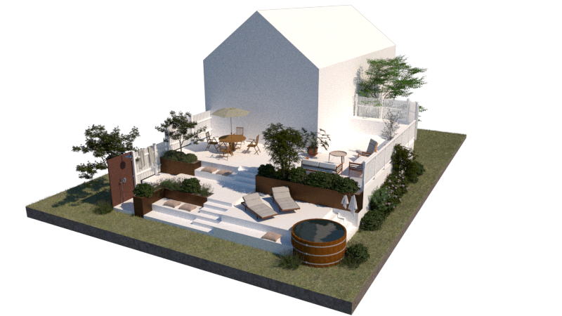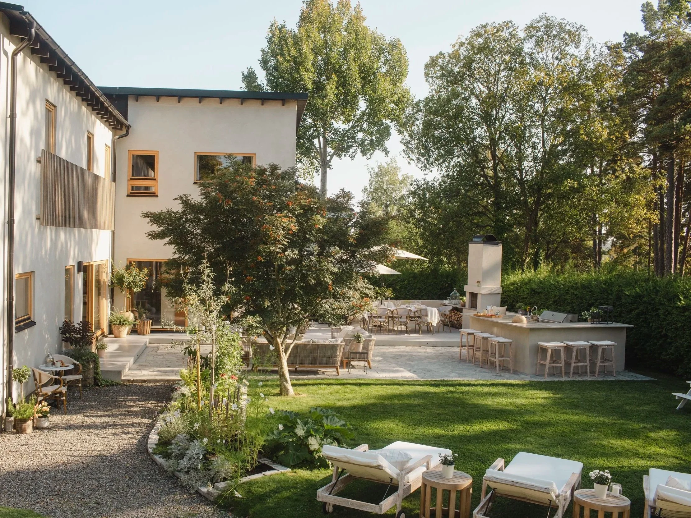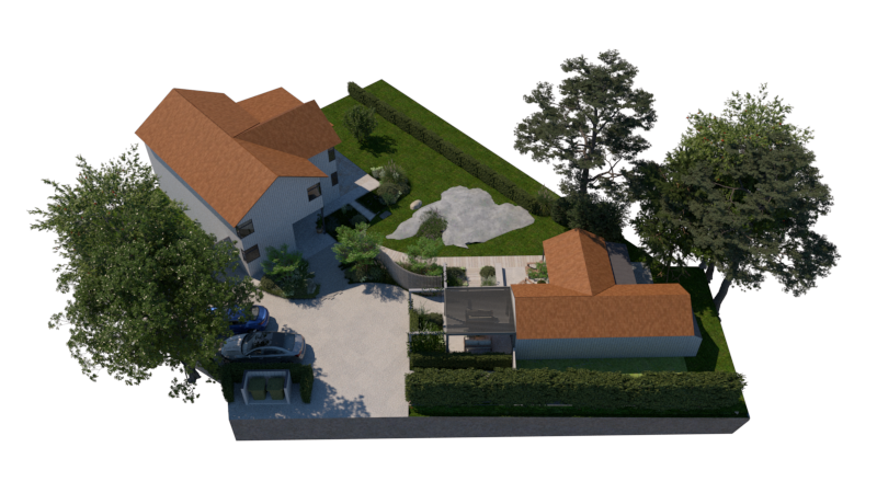 Tomten nya utemiljö skulle flörta med Gotland och Frankrike, något ute-miljön redan påminner om idag med sina thujahäckar och tallar. Ett nytt poolområde med utekök, nya umgängesytor samt ett område för lek skulle tillsammans skapa en harmonisk helhet.