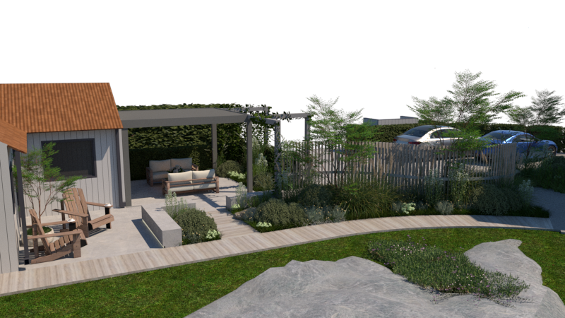 Denna vackra villa från 1910 har renoverats varsamt från 2019. Kunden hade en tydlig vision för utemiljön och att det skulle finnas en altan med plats för utekök, matbord, loungemöbler, solstolar, utedusch, förvaring och spa-bad. Allt detta skulle ombonas av varierande grönska med olika blomningstid. I detta projektet levererade vi ett komplett paket med designförslag, planteringsplan och detaljritningar på staket, altan och planteringskärl (med installerad långtidsbevattning) i nära samarbete med kund. 2024 påbörjas nästa etapp med resterande rabatter i trädgården.
