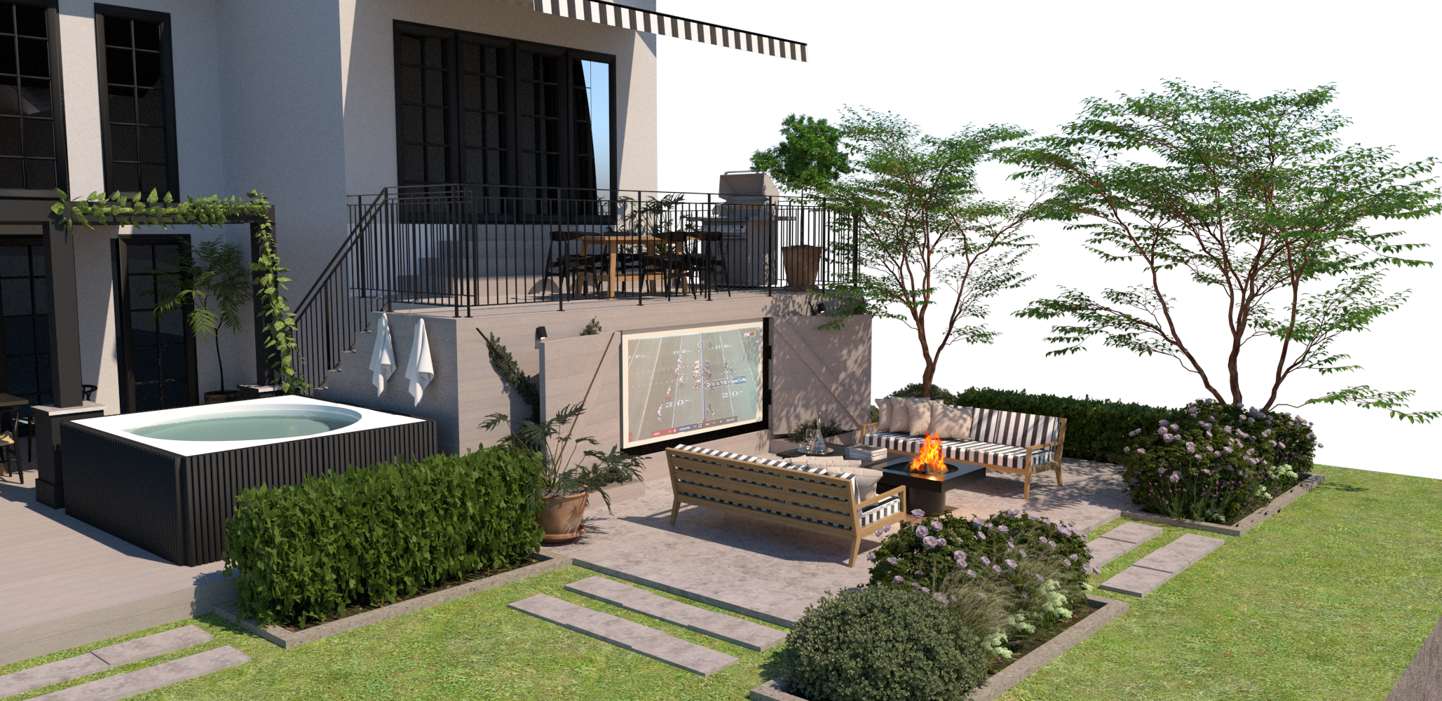 Ett par med en totalrenoverad villa behövde hjälp med att sy ihop utemiljön med huset. Tomtens nya utemiljö skulle flörta med den amerikanska moderna farmhouse-miljön med inspiration från t.ex. Hollander Designs. Amerikanska trädgårdar är ofta designade för att vara en förlängning av huset där många timmar ska spenderas vid grillen, i poolen eller framför TV:n. Här kan sportevent livestreamas på projektorduken bakom ladugårdsdörrarna på ljumna sommarkvällar. I detta projektet levererades endast ett designförslag då kund kunde realisera planerna på egen hand.